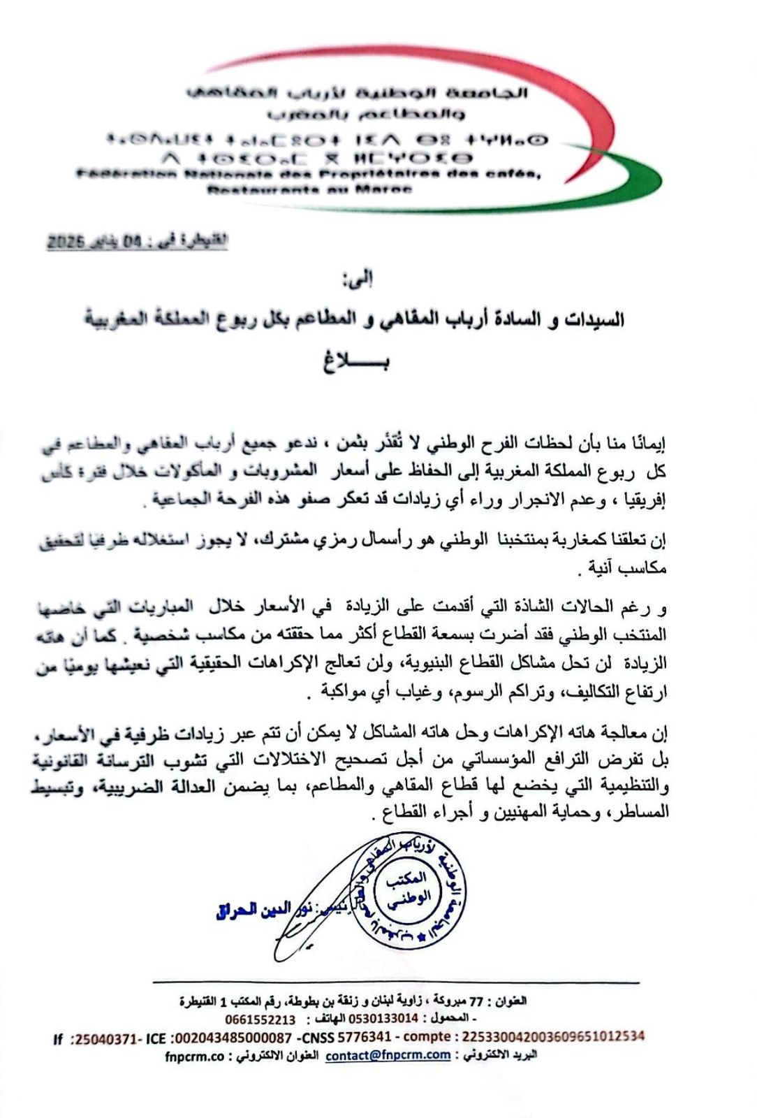 كما دعت الجامعة إلى اعتماد مقاربة تشاركية مسؤولة توازن بين مصلحة المهنيين وقدرة المستهلكين الشرائية، بما يضمن استدامة النشاط وحماية الاستقرار الاجتماعي والاقتصادي للقطاع.