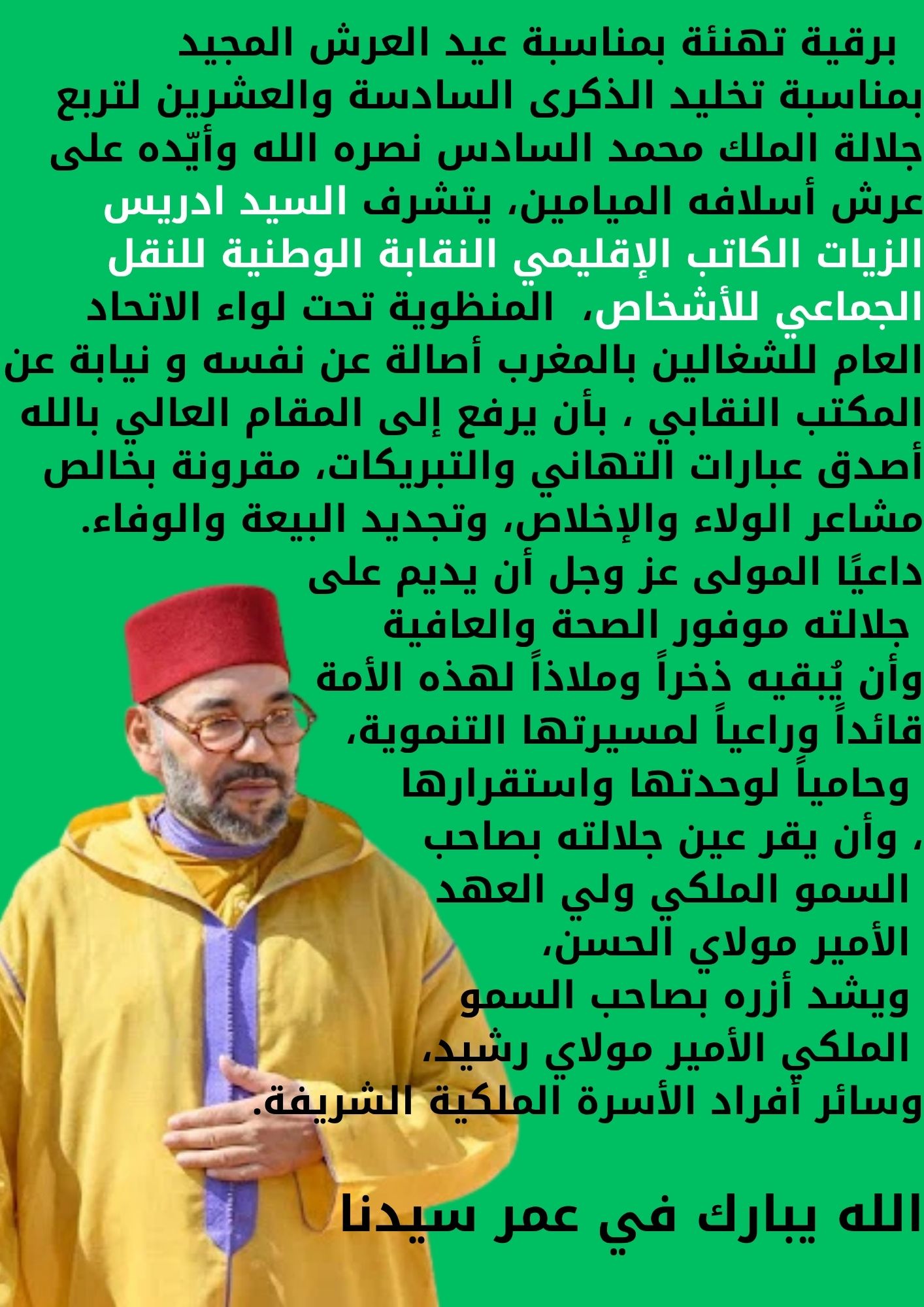 بمناسبة تخليد الذكرى السادسة والعشرين لتربع جلالة الملك محمد السادس نصره الله وأيّده على عرش أسلافه الميامين، يتشرف السيد ادريس الزيات، الكاتب الإقليمي النقابة الوطنية للنقل الجماعي للأشخاص بمكناس المنظوية تحت لواء الاتحاد العام للشغالين بالمغرب ، أصالة عن نفسه و نيابة عن المكتب النقابي ، بأن يرفع إلى المقام العالي بالله أصدق عبارات التهاني والتبريكات، مقرونة بخالص مشاعر الولاء والإخلاص، وتجديد البيعة والوفاء.