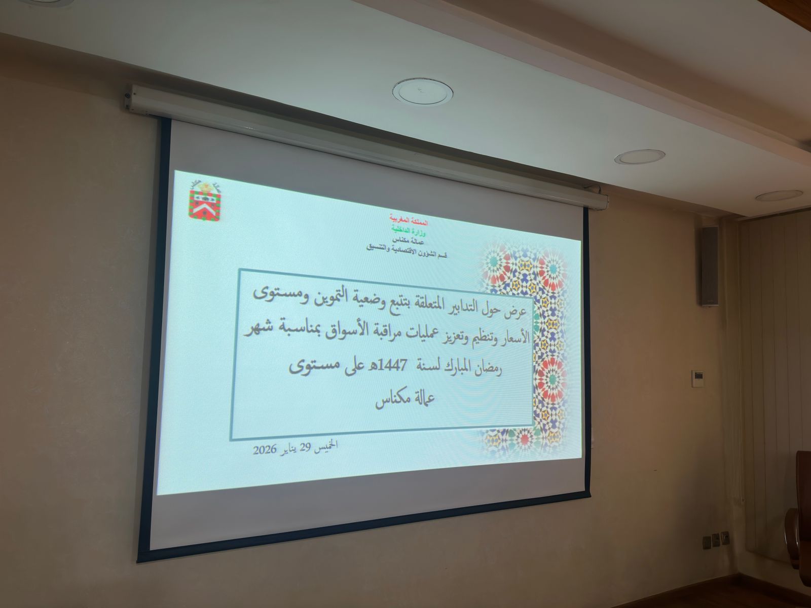 انعقد يومه الخميس 29 يناير 2026 على الساعة الواحدة زوالا بمقر العمالة اجتماع تنسيقي ترأسه السيد عبد الغني الصبار عامل عمالة مكناس وبحضور ممثلي مختلف المصالح اللاممركزة المعنية والسلطات الأمنية والمحلية، وخصص هذا الاجتماع لتدارس الإجراءات والتدابير الكفيلة بضمان التموين الكافي والمنتظم للأسواق وتعزيز وتكثيف عمليات المراقبة استعدادا لشهر رمضان المبارك 1447ه.