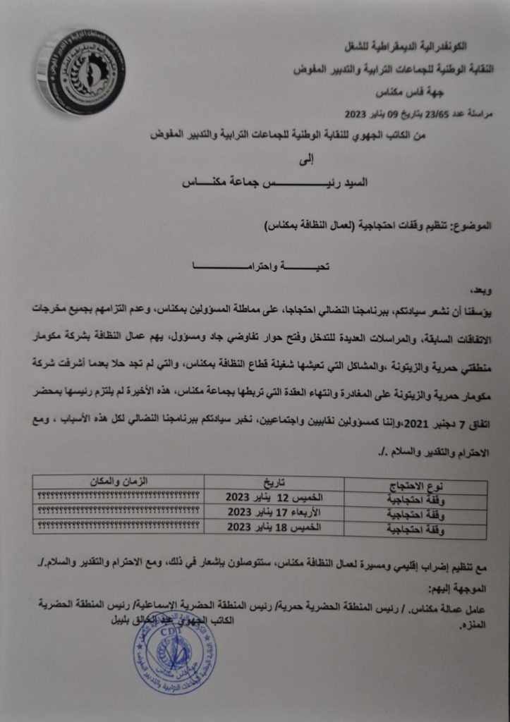 قرر المكتب النقابي لعمال النظافة شركة ميكومار الزيتونة وحمرية لجماعة مكناس، التابع للمكتب الجهوي للجماعات المحلية، والمنضوي تحت لواء الكنفدرالية الديمقراطية للشغل، خوض عديد من الإضرابات مصحوب بمسيرة لعمال النظافة ، وذلك في 12 و17 و18 من الشهر الجاري.