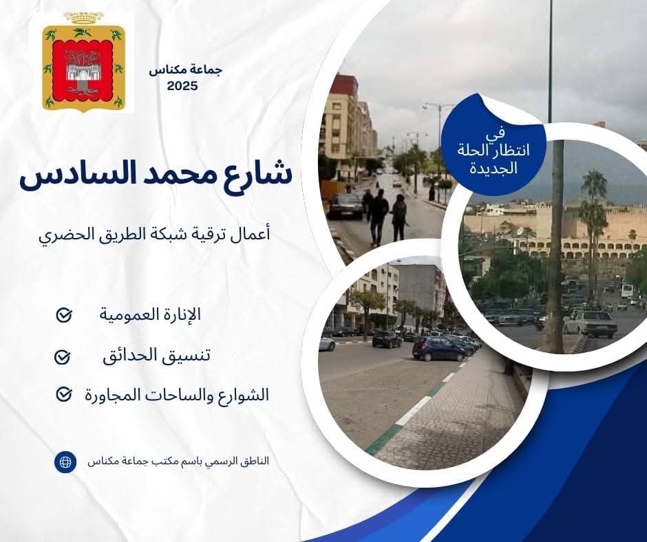 وفي هذا الإطار، يولي مكتب جماعة مكناس أهمية خاصة لترقية شبكة الطرق الحضرية، حيث يشمل البرنامج الحالي مشروع تأهيل شارع محمد السادس، باعتباره أحد المحاور الحيوية بالمدينة. ومن المنتظر أن يشمل هذا المشروع إعادة تأهيل الأرصفة، تحسين الإنارة العمومية، وتوسيع الطريق لتسهيل حركة السير وتعزيز جمالية هذا الشريان الرئيسي، الذي يشكل واجهة حضرية تعكس تطور المدينة وانفتاحها على المستقبل.