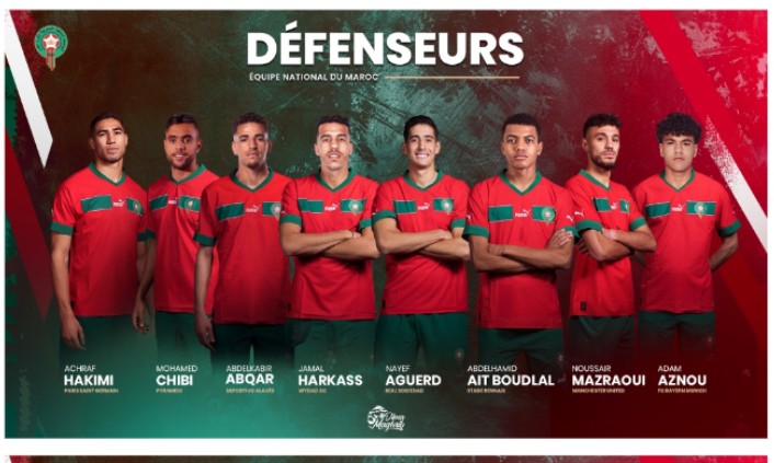 الدفاع: أشرف حكيمي (باريس سان جيرمان)، محمد شيبي (قطر القطري)، جمال حركاس (الرجاء الرياضي)، نايف أكرد (وست هام يونايتد)، نصير مزراوي (بايرن ميونخ)، أدم أزنو (بايرن ميونخ)، عبد الحميد أيت بودلال (الفتح الرباطي)، عبد الكبير عبقار (ديبورتيفو ألافيس).