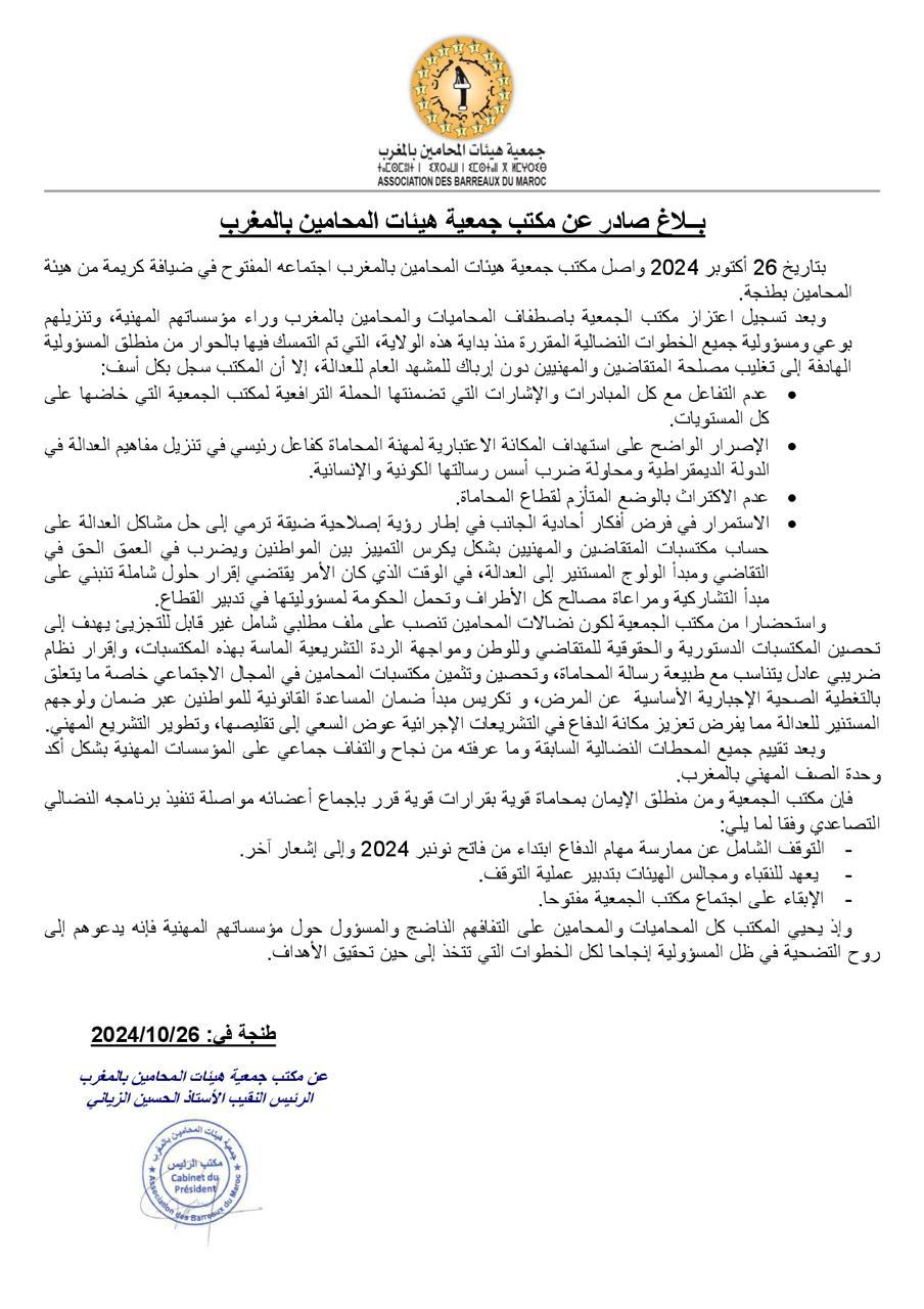 في خطوة احتجاجية تصعيدية غير مسبوقة، أعلنت جمعية هيئات المحامين بالمغرب، التوقف عن ممارسة مهنة الدفاع ابتداءً من فاتح نونبر 2024 حتى إشعار آخر.